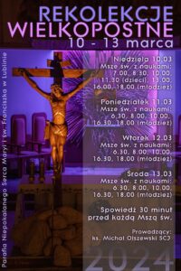 - Rozpoczęliśmy rekolekcje wielkopostne, które potrwają do środy. Msze św. z nauką rekolekcyjną od poniedziałku do środy w następującym porządku: o godz. 6.30, 8.00, 10.00, 16.30 i 18.00. Spowiedź 30 min. przed każdą Mszą św. W ciągu dnia zapraszamy również na modlitwę osobistą do kaplicy adoracji. Ofiary składane na tacę w środę, na zakończenie rekolekcji, będą darem wdzięczności wobec rekolekcjonisty ks. Michała Olszewskiego. Od poniedziałku do środy z racji rekolekcji nie będzie Mszy św. o godz. 7.15. Program rekolekcji umieszczony jest na plakatach przed kościołem i na stronie internetowej parafii.