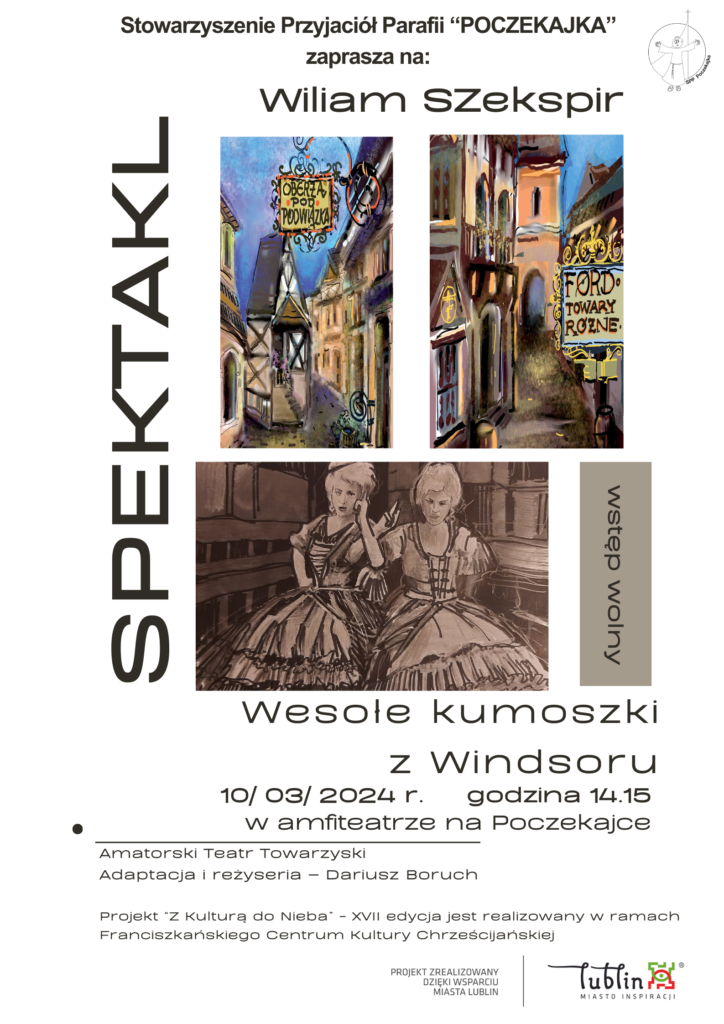 - Jeszcze dzisiaj Stowarzyszenie Przyjaciół Parafii “POCZEKAJKA” zaprasza na kolejne wydarzenie „Z Kulturą do Nieba” – Spektakl teatralny – komedia Wiliama Szekspira „Wesołe kumoszki z Windsoru”, w wykonaniu Amatorskiego Teatru Towarzyskiego z Lublina. Spektakl o godz. 14.15 w amfiteatrze. Serdecznie zapraszamy!